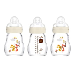 MAM Garrafa de vidro premium Feel Good Slow Flow, fácil de alternar entre o peito e a mamadeira, 142 g, 0+ meses, unissex, pacote com 3 - VIDRO PREMIUM: Feito de vidro resistente à temperatura de alta qualidade, a mamadeira pode ser aquecida, limpa na máquina de lavar louça e esterilizada em altas temperaturas. - Tampa de poeira: a tampa de poeira à prova de derramamento para bebês protege a mamadeira da sujeira e funciona como um copo medidor até mesmo para as menores quantidades, graças à sua escala integrada. - Amamentação livremente, um bico de silicone alongado, projetado como um mamilo, facilita uma transição fácil entre amamentação e mamadeira, apoiando a ligação mãe-bebê. - Garrafa livre de BPS/BPA: todas as mamadeiras MAM Feel Good são 100% livres de BPA e BPS, tornando-as ideais para alimentação do bebê, paz de espírito para os pais e um começo de vida ideal para bebês. - DETALHES DO PRODUTO: Garrafa de vidro premium MAM Feel Good, 142 g, 0+ meses, unissex, pacote com 3