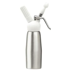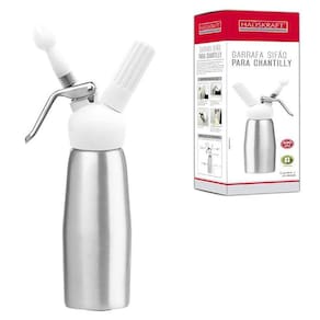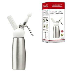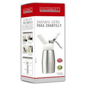 A Garrafa para Chantilly 500 ml em Alumínio Hauskraft é feito em garrafa com cápsula de gás é de longe o mais fresco e o mais cremoso que você já provou. Quando se utiliza a Garrafa para Chantilly 500 ml em Alumínio Hauskraft não há desperdício, pois o que você não utilizar pode permanecer fresco na garrafa por até duas semanas na geladeira. O gás NO2 inibe a proliferação de bactérias. Cada cápsula produz 4 vezes o volume de creme adicionado. Este tipo de garrafa tem sido muito utilizado na coquetelaria também, para a finalização de coquetéis como o Moscow Mule, que vai uma camada de espuma de gengibre.Instruções de uso:• 1 Encher o sifão com o líquido até alcançar a capacidade máxima indicada na garrafa;• 2 Insira a cápsula de gás, em seguida encaixe o porta-cápsula para chantilly no sifão;• 3 Agite o sifão até adquirir a consistência desejada;• 4 Para retirar sempre aplicar o sifão segurando-o de cabeça para baixo (nunca abra o sifão com gás, retire o gás em posição vertical, para depois desrosquear e abrir).Contém:• 1 Garrafa: 11x8x27 cm (Capacidade: 500ml);• 1 Tampa da válvula: 2,5x2,5x2 cm;• 1 Bico tulipa: 2,5x2,5x5,7 cm;• 1 Bico reto: 1,6x1,6x5,4 cm;• 1 Bico reto: 1,6x1,6x5,5 cm;• 1 Porta-cápsula: 2,8x2,8x7,7 cm;• 1 Escova de limpeza: 9,3x1x1 cm.Características:• Compatível com cápsula de gás 8g, não inclusa.Recomendações:Esta garrafa não suporta altas temperaturas e pode acarretar a danificação da válvula de vedação.Este item possui peças de reposição para serem substituídas.Leia completamente as instruções com atenção antes de usar a garrafa pela primeira vez;Não abrir a garrafa enquanto houver gás dentro dela.Observações:Alguns ingredientes líquidos, como sucos, espumas, café, chocolate, creme de baunilha, iogurte, etc. podem ser usados na garrafa de chantilly, mas somente se não contiverem substâncias insolúveis que poderão entupir aCódigo de Barras:7896980443080 Referência:SIFG001 Marca:Hauskraft Composição/Material:Alumínio Dimensões aproximadas do produto (cm):31x9x9 cm Peso aproximado do produto (kg):0.715 kg