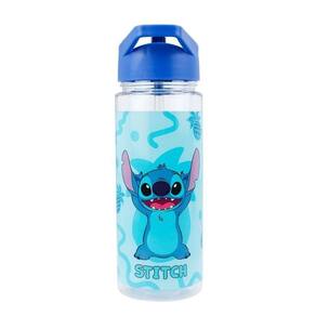 Garrafa de plástico com canudo e capacidade para 450 ml estampada com rosto do Stitch. Vem dentro uma mochila tipo saco com 41 x 31 cm de dimensão na mesma característica. Material: garrafa de plástico; mochila de poliéster.