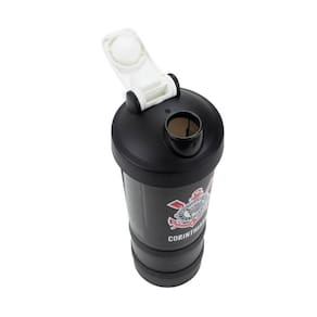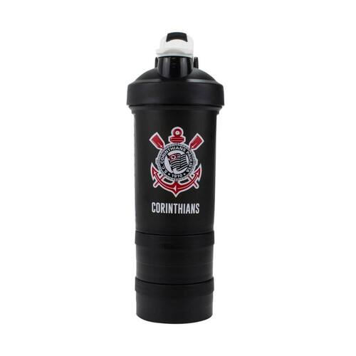 Garrafa Shakeira Mola 2 Compartimentos 500ml - Corinthians Garrafa Shakeira Mola 2 Compartimentos 500ml - Corinthians Garrafa de plástico do tipo shakeira com 500 ml de capacidade. Vem com 2 compartimentos de tampa rosqueável para armazenar suplementos, um com 3x7,5cm e outro com 4x7,5 cm de dimensão. Interior da garrafa vem com mola blender. Tampa abre e fecha e suporte para carregar na mão ou prender na mochila. Tudo isso customizado na cor e gravado com escudo do Sport Club Corinrhians. Detalhes: Peso 0,200 gramas; Altura 26cm; Largura 10cm; Comprimento 10cm; Material: plástico e metal