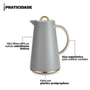 Distribuído por feheros shop Garrafa térmica 1 litro samira café chá premium alça dourada click abre e fecha Atenção A garrafa térmica samira 1 litro é ideal para manter bebidas quentes ou frias por mais tempo. Com design moderno e elegante, combina com qualquer ambiente. Com capacidade de 1 litro, é perfeita para o uso diário. Feita com materiais de alta qualidade e livre de bpa, garantindo segurança e eficiência térmica. Não utilizar bebidas gaseificadas, leite ou derivados, pois podem gerar pressão interna e danificar a garrafa. Também não deve ir ao micro-ondas, freezer, geladeira ou lava-louças. Para manter o desempenho, siga as orientações de uso e conservação. Informações do produto Para quem busca praticidade e eficiência, essa garrafa é ideal. Conserva líquidos quentes como café, chá e leite ou frios como sucos e água. Seu acabamento fosco premium, alça dourada ergonômica e tampa com sistema click proporcionam praticidade, elegância e vedação segura. Possui bico antigotejamento que evita respingos ao servir. A tampa click facilita abrir e fechar, preservando a temperatura e evitando vazamentos. Especificações técnicas - design sofisticado e versátil: combina com qualquer estilo, agregando elegância e praticidade ao ambiente, seja em casa ou no trabalho. - praticidade no dia a dia: a abertura facilita o preenchimento, a limpeza e o manuseio, tornando o uso diário ainda mais fácil. - fechamento de alta qualidade: garante eficiência térmica, evitando vazamentos e mantendo a temperatura por mais tempo. - material premium e durabilidade: feita com polipropileno resistente e revestimento interno de vidro, garantindo durabilidade e eficiência. - facilidade no transporte: alça ergonômica para transporte prático e sem esforço. - ideal para presentear: escolha perfeita para surpreender aquela pessoa especial em casamentos, chás de cozinha, ou até de casa nova. Ficha técnica do produto Altura total: 27 cm Diâmetro da base: 15,5 cm Peso: 650 g Capacidade: 1 l Material externo: polipropileno com acabamento fosco Material interno: vidro Tampa: click abre e fecha com vedação hermética Alça: dourada fixa Com bico antigotejamento Conserva líquidos quentes por até 6 horas Conserva líquidos frios por até 12 horas Produto atóxico Antes e depois do primeiro uso: - antes: lave a garrafa com água morna e sabão neutro para remover qualquer resíduo de fabricação. Após a limpeza, é importante fazer um pré-aquecimento ou pré-resfriamento, dependendo da bebida que você deseja manter na temperatura ideal. Para bebidas quentes, adicione água quente na garrafa e deixe por alguns minutos. Para bebidas frias, faça o pré-resfriamento com água gelada, também por alguns minutos. - depois: lave manualmente com sabão neutro e uma esponja macia. Evite o uso de produtos abrasivos ou máquina de lavar louças, para preservar a integridade do revestimento e a eficiência térmica. Itens inclusos no pacote 01 garrafa térmica samira 1 litro com alça dourada e tampa click Todas as fotos são reais dos produtos, qualquer dúvida estamos à disposição Dúvidas frequentes 01- a garrafa é nova Acompanha 03 - a garrafa térmica é realmente eficiente para manter a temperatura por muito tempo R: sim, a garrafa térmica possui excelente vedação e tecnologia de isolamento, garantindo que sua bebida se mantenha quente ou fria por várias horas. 04- a garrafa pode ser lavada na máquina de lavar louças R: recomendamos que a lavagem seja feita manualmente, com água morna e sabão neutro, para garantir a longevidade do produto e evitar danos ao revestimento. 05- como faço para acompanhar o envio R: você pode acompanhar o envio por meio do código de rastreamento fornecido na sua conta após a confirmação do envio.