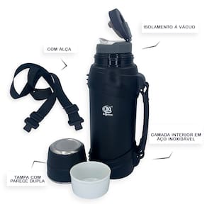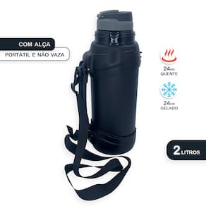 Garrafa térmica de 2 litros em aço inox. - Com parede dupla e isolamento a vácuo. - Tampa com parede dupla, tampa pode ser utilizada como copo. - Com alça revestida em borracha e resistente. - Capacidade de 2 litros. - Peso: 1.015 kg. - Portátil e nao vaza. - Ideal para Lazer, Aventura, Trabalho e Dia a Dia. Conserva a tempetura da bebida quente e gelada por 24 horas.