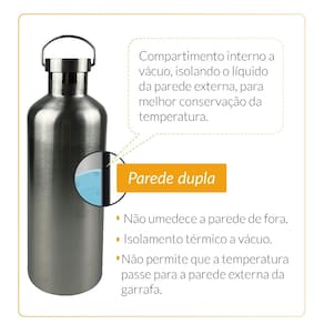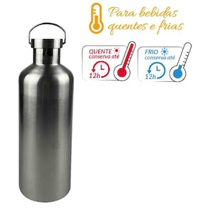 GARRAFA SQUEEZE TÉRMICA DE ÁGUA AÇO INOX 1,5 LITROS PAREDE DUPLA.IDEAL PARA ACADEMIA, TRILHA, CAMPING, VIAGEM, ACAMPAMENTO DENTRE OUTRAS DIVERSAS SITUAÇÕES PARA BEBER ÁGUA GELADA PARA REFRESCAR E MANTER A SAÚDE.MANTENHA SUA BEBIDA GELADA COM A GARRAFA DE ÁGUA INOX 1,5 LITROSDeguste suas bebidas favoritas sem ter o risco de beber algo com "GOSTO OU CHEIRO DE PLÁSTICO"Construção em INOX e com PAREDE DUPLA ajudando a evitar que sabores e cheiros permaneçam na garrafa mesmo após a sua lavagem.Você poderá ter a PRATICIDADE E PORTABILIDADE de levar a sua bebida favorita para qualquer lugar.Seu DESIGN permite e garante que suas bebidas durem MAIS TEMPO DO QUE GARRAFAS COMUNS E CONVÊNCIONAIS DE PLÁSTICOCARATERÍSTICAS- Tampa rosca hermética.- Resistente a corrosão- Parede Dupla - Alça de Transporte- Isolamento térmico À Vacuo- Portátil- Conserva até aproximadamente 12 horas com BEDIDAS QUENTES- Conserva até aproximadamente 24 horas com BEBIDAS FRIASESPECIFICAÇÕES- Material: Aço Inox- Capacidade: 1,5 Litros- Dimensões: 31 x 10 x 10- Tamanho do bocal: 4 cm- Peso: Aproximadamente 506 gramasDICAS DE USO- Lave a garrafa com detergente neutro e esponja macia.- NÃO USE esponjas de aço ou a parte verde de esponjas para a lavagem, pois tais produtos podem riscar ou danificar a garrafa.- Seque após a lavagem com um pano macio.- Cuidado com a utilização de bebidas quentes, pois a garrafa se iguala a temperatura do líquido, então tome cuidado VALIDAR- Recomendamos EVITAR deixar o produto exposto ao sol.PERGUNTAS FREQUENTESPERGUNTA: A Garrafa transfere a temperatura ?RESPOSTA: Esse modelo não transfere.PERGUNTA: A garrafa pode ser personalizada ?RESPOSTA: Não recomendamos a personalização do produtoItens Inclusos- 1x Garrafa de Água Inox 1,5 LitrosAviso legal• Livre de BPA.