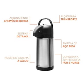 Com estrutura em alumínio que não acumula resíduos e facilita a limpeza, a Garrafa térmica de 1,9L da Brinox possui ampola de aço inox com sistema a vácuo que, conserva a temperatura da sua bebida quente ou fria por mais tempo, garantindo até 6 horas de autonomia. Seu acionamento, através de uma bomba, potencializa a pressão e facilita a saída do líquido. Além disso, a garrafa possui uma trava que garante mais segurança ao utilizar líquidos quentes. Sua alça de transporte facilita a mobilidade do produto. Nessa versão, com 1,9 L de capacidade e 22 X 15,5 X 30,5 cm de dimensão. Material: Aço Inox Composição: 01 Garrafas Térmicas Marca: Brinox Linhas: Garrafa Térmicas Tipo de Produto: Ferramentas de Cozinha