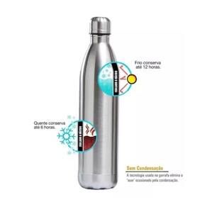 Garrafa térmica em aço inox possui compartimento interno a vácuo, isolando o líquido da parede externa, para melhor conservação da temperatura. Parede dupla. Não umedece a parede de fora. Conserva quente por até 6h e fria por até 12h.