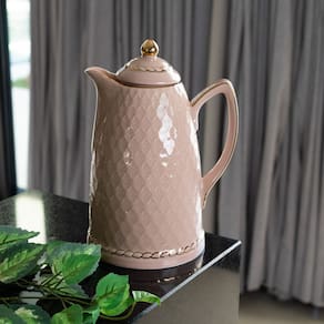 A garrafa térmica de porcelana é um item que traz muito charme para o cafezinho do dia a dia, ou para aquele chá especial entre amigas. A garrafa térmica tem exterior com detalhes de renda rosa e filetes dourados na tampa, na alça, na borda e na base da garra térmica. Em seu interior, a ampola de vidro é o que garante a temperatura dos líquidos seja preservada por mais tempo na garrafa.
