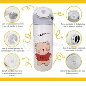 Esta garrafinha térmica é ideal para crianças pequenas, combinando funcionalidade e um visual encantador. Com seu design de ursinho, ela é perfeita para acompanhar os momentos de hidratação dos pequenos, seja na , passeios ou em casa.