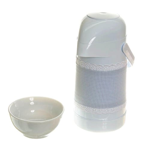 Economize trabalho e aposte na praticidade de ter água quentinha sempre à mão para limpar o bebê Essa garrafa térmica é produzida com matéria prima de excelente qualidade e resistência. Sem dúvidas, esse kit de garrafa com molhadeira é um item fundamental para o kit de higiene do bebê. Dados Técnicos 01 Garrafa Térmica marca Termolar modelo Magic Pump 500 ml com capa de tecido e tiras aderentes. 01 Molhadeira em porcelana branca Medidas Garrafa: 11 cm diâmetro x 25 cm altura Molhadeira: 11,5 cm diâmetro x 5,5 cm altura