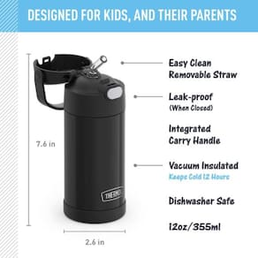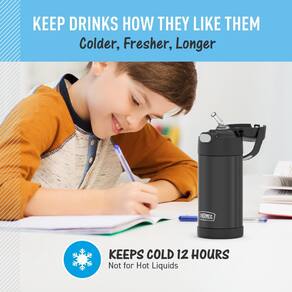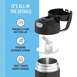 Projetada para mãos pequenas, a Thermos Funtainer F401 permite que a criança abra e feche com facilidade usando apenas uma mão, graças ao seu sistema de abertura intuitivo, ergonômico e higiênico, já que a tampa permanece fechada após o uso, sem contato com o ambiente. O canudo de silicone macio proporciona um toque suave ao beber, enquanto a alça integrada facilita o transporte, perfeita para a escola, passeios e atividades ao ar livre.