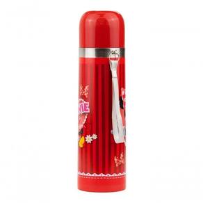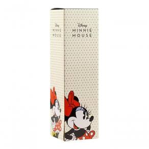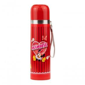 Garrafa térmica na cor vermelha gravada com a imagem da Minnie. Capacidade para 500 ml, tampa serve como copo para a bebida, que não pode ser tomada direto da garrafa. Mantém temperatura por até 2 horas a depender da temperatura ambiente. Material: plástico e inox