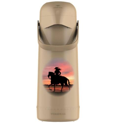 A ;Garrafa Térmica Magic Pump Campeira Feminina 1L Termolar ;combina funcionalidade e estilo em um único produto. Com uma capacidade de 1 litro, ela é ideal para manter suas bebidas quentes por até 12 horas ou frias por até 24 horas, graças à sua eficiente ampola de vidro. O design elegante com uma ilustração de cavalo em meio ao pôr do sol traz um toque especial, tornando-a uma peça não apenas funcional, mas também com apelo visual. Além disso, a garrafa é decorada e feita com material externo de plástico resistente, proporcionando maior durabilidade.