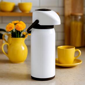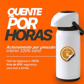 Capacidade de 1,8 litro Cor branca com acabamento elegante e discreto Tampa e alça em polipropileno resistente Ampola interna de vidro, ideal para manter bebidas quentes ou frias por horas Acionamento por pressão para uso prático e seguro Design funcional, com alça para transporte fácil e uso em qualquer ocasião