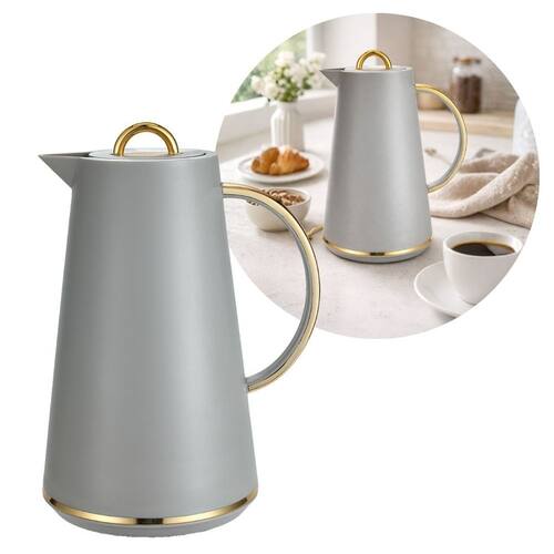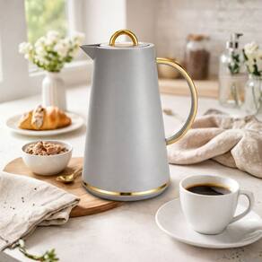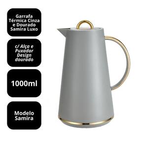 Com capacidade para 1 litro, ela é ideal para servir café, chá ou outras bebidas quentes com eficiência térmica. Seu design moderno se destaca pela alça redonda slim, acabamento refinado em cinza com detalhes dourados luxo e borda dourada decorativa, que trazem um toque contemporâneo e elegante ao ambiente.