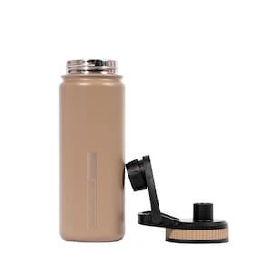 Possui acabamento externo em pintura eletrostática a pó, altamente resistente. Isolamento a vácuo de parede dupla, garantindo capacidade térmica de 24 horas para bebidas geladas e 12 horas para bebidas quentes. Tampas em polímero com vedação interna em silicone, impedindo qualquer vazamento. Alça da tampa menor com trava para segurança, evitando que a tampa volte no rosto quando utilizada. Feita em Aço Inox 304 SUS e livre de BPA.