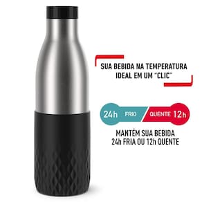 Sua bebida na temperatura ideal com apenas um ""clic"" usando a Garrafa Térmica Tefal Bludrop Preta 700ml, que mantém sua bebida por até 24h fria ou 12h quente. Esta garrafa, feita de aço inoxidável durável com acabamento em silicone, não só oferece estilo, mas também muito mais firmeza e segurança no seu dia a dia. Design feito 100% à prova de vazamentos, torna o transporte fácil e sem preocupações. Botão abre e fecha fácil com apenas um ""clic"", centralizado na tampa para não entrar em contato com a sua bebida. Diferenciais: - Mantém sua bebida 24h fria ou 12h quente. - Abre fácil, com apenas um ""clic"" - À prova de vazamentos. - Acabamento em silicone, muito mais firmeza. - Compatível com máquina de lavar louças. - Aço inoxidável: Material com isolamento térmico e resistente. - Fácil de limpar: Tampa totalmente desmontável. Desfrute da praticidade e elegância, garantindo que sua bebida esteja sempre na temperatura ideal em um ""clic"" com a Garrafa Térmica Tefal Bludrop Preta de 700ml.