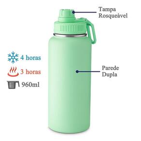 A Garrafa Térmica Verde de 960ml é a escolha ideal para quem valoriza a praticidade e a eficiência no armazenamento de bebidas, tanto quentes quanto frias. Seu design contemporâneo combina estilo e funcionalidades, sendo perfeita para uso diário, em casa, no trabalho ou em aventuras ao ar livre.