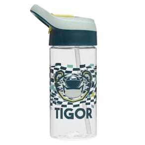 Garrafa de plástico Tigor que conta com canudo, alça para pendurar e silk frontal.