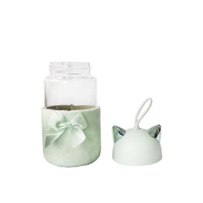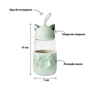 Garrafa de vidro com tampa de plástico rosqueável e alça para transporte em silicone, além de uma charmosa proteção da base feita em veludo com lacinho frontal.