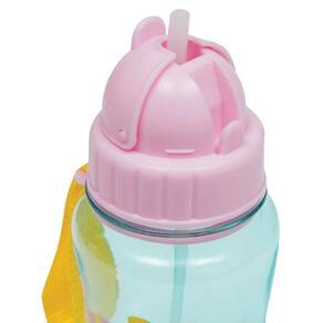 Possui proteção de uma tampa flip-top, com canudo em silicone e retrátil; vem com pulseira para ajudar a criança carregar sua garrafinha