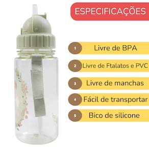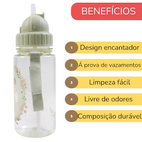 Conteúdo da Embalagem: 1 unidade. Tampa Flip-Top: Com sistema à prova de vazamentos para maior praticidade. Livre de Substâncias Nocivas: BPA, Ftalatos e PVC. Medidas: 19cm x 6cm x 6cm. Composição: Garrafa em Tritan, Tampa em Polipropileno (PP) e Bico em Silicone. Limpeza e Manutenção: