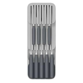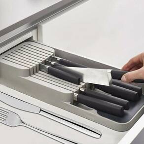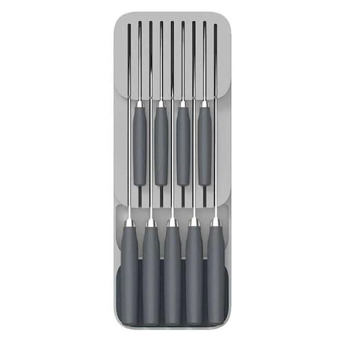 Armazenar facas afiadas nas gavetas pode ser perigoso e também pode danificar as lâminas caras. Este organizador de facas de 2 camadas é a solução perfeita proporcionando armazenamento seguro e fácil acesso a uma variedade de facas de cozinha.