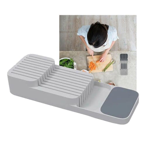 Armazenar facas afiadas nas gavetas pode ser perigoso e também pode danificar as lâminas caras. Este organizador de facas de 2 camadas é a solução perfeita proporcionando armazenamento seguro e fácil acesso a uma variedade de facas de cozinha.