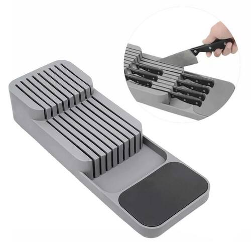 Características do Produto: 1. Feito de material polipropileno de qualidade alimentar 100%, passou o padrão FDA/LFGB 2. Design multicamadas para fácil armazenamento 3. Simples e prático, higiênico e saudável, com base antiderrapante. 4. Cor: Cinza 5. Material: polipropileno 6. Capacidade: 18 lugares ideal para 9 facas 7. Função: Armazenamento na cozinha