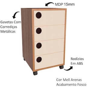 Características adicionais: 4 gavetas com puxadores embutidos, corrediças metálicas, rodízios em ABS.