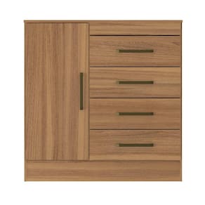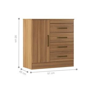 Ela conta com 4 gavetas espaçosas com corrediças metálicas telescópicas e um compartimento lateral, com porta e prateleira móvel