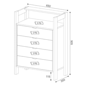 Características: Estrutura em MDP Acabamento BP 4 Gavetas Corrediça metálica Puxador em alumínio Tampo suporta até 5 kg Gavetas suportam até 3 kg cada