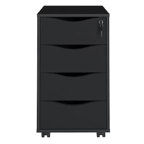 Características do Gaveteiro 4 Gavetas com Chave e Rodízios Pit: - Estrutura em MDP 15mm de espessura com fita de borda PVC com 0,45mm de espessura; - Fundo das gavetas em MDF de 3mm de espessura; - Fundo do gaveteiro em MDF de 3mm de espessura; - 4 Gavetas com corrediças metálicas de 350mm; - Rodízios em PVC com 55mm de altura e fixação por pino de aço; - Não acompanha objetos decorativos; - Montagem por conta do comprador;