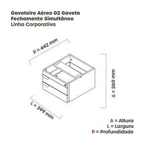 O Gaveteiro Aéreo 02 Gavetas Corporativo é um móvel prático e funcional que ajuda a organizar seu espaço de trabalho. Ele é suspenso, o que otimiza o espaço na mesa e facilita o acesso aos seus materiais. As duas gavetas são espaçosas e possuem travamento simultâneo, garantindo a segurança dos seus pertences. Acabamento da Gaveta: Melamínico Ambiente Principal: Escritório Complexidade da Montagem: Média: pode ser montado por mais de uma pessoa e/ou necessite de maior conhecimento para montagem Cor: Walnut/Preto Cor do Produto: Walnut/Preto Cor Interna: Walnut/Preto Escala de Brilho: Semi-Fosco Escala de Brilho da Gaveta: Semi-Fosco Gaveta com Chave: 01 Itens Inclusos: Um Gaveteiro Linha ou Coleção: Corporativa Manual de Montagem e Instalação: https://product-hub-prd.madeiramadeira.com.br/910537/documents/1a9a2e3b-38f1-485e-992c-779cffe1cf531979963387017164929865596.pdf Material da Gaveta: MDP Material do Puxador da Gaveta: MDP Material Principal: MDP Necessita Montagem: Sim Origem do Produto: Nacional Peso: 6,9091 kg Peso Máximo por Gaveta: 15 kg Possui Portas: Não Possui Prateleiras: Não Recomendações de Uso, Manutenção e Limpeza: Limpeza deve ser feita com um pano levemente umedecido e um pano seco. Sapatas Niveladoras: Não Sistema de Montagem: Parafuso Suporta Até (kg): 20 kg Tipo de Corrediça da Gaveta: Metálica Telescópica Tipo de Puxador da Gaveta: Externo