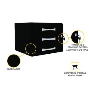 De aéreo só o nome técnico - porque esse gaveteiro preto vai ancorar direitinho no seu escritório e auxiliar na organização do seu dia a dia! Com suas três gavetas, ele é ideal para quem precisa otimizar espaço e guardar documentos, objetos profissionais e pessoais, papelada, papéis, cartas e tudo o que você precisar. Esse módulo é um complemento para as mesas da linha Maxxi da Pandin, tornando-se uma opção prática e viável para mudanças rápidas. Projetado em aço e revestido em madeira MDP, este gaveteiro de 3 gavetas pode ser instalado abaixo de mesas em poucos passos e dá a você toda a segurança que precisa, com a possibilidade de trancar as duas gavetas superiores. Esta peça feita para quem preza por organização e segurança faz parte da Linha Maxxi de móveis para escritório da Pandin, a linha ideal para quem procura por ambientes de trabalho funcionais e formatos que permitem diversas formas de ambientação. Aposte certeiro na Linha Maxxi Pandin quando o assunto for praticidade, qualidade e versatilidade.