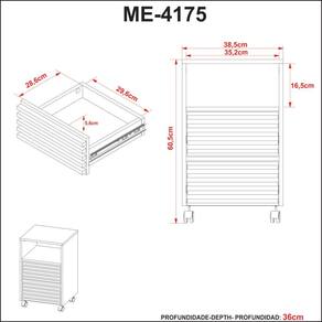 O Gaveteiro ME4175 é produzido em MDP 15mm e acabamento BP. A estrutura do fundo é em MDP 3mm. Possui 2 gavetas com detalhe em ripado, corrediças telescópicas e que suportam até 3kgs cada. Possui 4 rodízios plásticos. Produto suporta até 26kgs. Conteúdo da embalagem: móvel, ferragens e manual de montagem. A fixação das peças e/ou acessórios é feita por parafusos, cavilhas e minifix. Para uma limpeza mais efetiva, utilizar apenas pano macio umedecido e sabão neutro. Não utilizar produtos abrasivos. Garantia de 03 meses contra defeitos de fabricação. Medidas do produto (AxLxP): 60,5x38,5x36cm. Peso do produto: 11,9kgs.