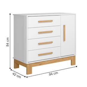 A cômoda é feita em MDP 15mm, possuindo quatro gavetas com corrediças metálicas e uma porta com amplo espaço para organizar sapatos e roupas.
