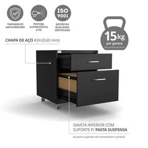 1 gaveta menor porta-objetos e 1 gaveta maior c/ suporte para pastas suspensas.