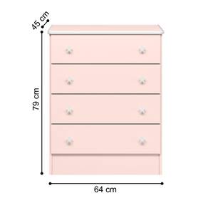 A cômoda é feita em MDP 15/12mm, possuindo quatro gavetas com corrediças metálicas.