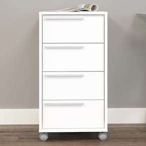 O(a) Gaveteiro Exclusive 4 Gavetas com Rodízios Branco - Loja é produzido em MDF e MDP na escala de brilho Fosco, e possui um grau de dificuldade de montagem: Médio.
