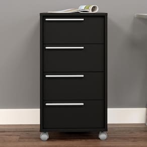 O(a) Gaveteiro Exclusive 4 Gavetas com Rodízios Preto - Loja é produzido em MDF e MDP na escala de brilho Fosco, e possui um grau de dificuldade de montagem: Médio.