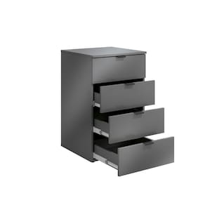 Cor: Chumbo | Corrediças: Telescópicas | Gavetas: Externas | Matéria-prima: MDP BP | Peso suportado por gaveta: 6 kg | Puxadores: Metálicos | Quantidade de gavetas: 4 | Sistema de montagem: Parafuso Philips e Minifix