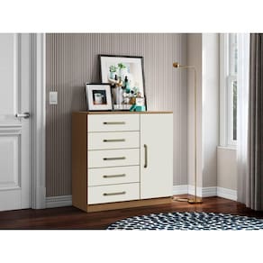 A Cômoda 5 Gavetas 1 Porta Milão Aramóveis, fabricada em MDP 15mm e 12mm de espessura. Seu espaçoso interior proporciona estabilidade ao móvel, enquanto os puxadores de plástico conferem resistência. Equipada com dobradiças metálicas, a cômoda oferece maior facilidade ao abrir e fechar as portas. O acabamento em verniz de alto brilho não apenas conserva o móvel, mas também proporciona uma estética contínua, garantindo beleza, resistência e prolongando a vida útil do produto.