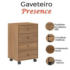 Para deixar seu quarto mais funcional e organizado apresentamos o gaveteiro da linha Presence fabricado pela Demóbile com materiais de alta qualidade em MDP. Possui 4 gavetas equipadas com corrediças metálicas puxadores e rodízios em plástico ABS. Não perca mais tempo a hora e agora venha garantir já o seu!