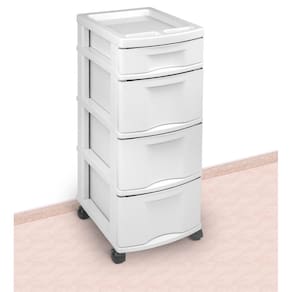 Descrição do produto 3 gavetas grandes brancas 1 gaveta pequena branca Estrutura branca 4 rodízios de plástico preto