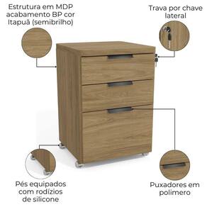 Gaveteiro Pasta Suspensa Versátil, solução funcional com design inteligente para escritórios modernos e ambientes corporativos. Estrutura em MDP (base 15 mm e tampo 30 mm) com acabamento em pintura BP. Possui duas gavetas (sendo uma com trava por chave na lateral) e um gavetão pasta suspensa. Os puxadores são em polipropileno e os rodízios em silicone, garantindo mobilidade e praticidade no dia a dia corporativo. Este produto chegará em sua casa separado em 1 volume.