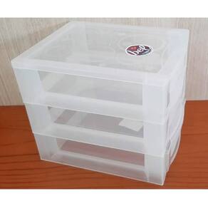 Garantia: 90 dias / Peso: 200g / Cor predominante: transparente / Ref.: 7898335078237; Dimensões de cada gaveta: 16,5cm (C) x 11,5cm (L) x 3,5cm (A); Dimensões totais: 16,5cm (C) x 13cm (L) x 13,5cm (A); Total de gavetas: 3; Material: polipropileno; Conteúdo: 1 gaveteiro de mesa; Cuidados: não lavar com materiais químicos ou abrasivos.