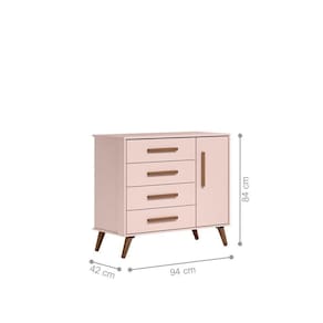 Esta cômoda foi feita para quem procura um móvel funcional e espaçoso para o quarto do bebê. Possui quatro gavetas e uma repartição de sapateira, proporcionando mais organização para vestuário e demais objetos.