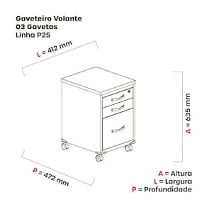 Gaveteiro volante com tampo de 25mm de espessura com acabamentos em fita ABS 1mm. Com 3 gavetas com frente em MDP 15mm , com sistema de deslizamento por trilho corrediça com roldana de nylon com capacidade de 20kg por gaveta. Consegue combinar facilmente com outras mobílias sem atrapalhar a decoração, pois possui um design clássico. É ideal para desempenhar tarefas diárias de trabalho , ele oferece espaço para você e deixa o seu local de trabalho muito mais organizado e elegante. Acabamento da Gaveta: Pintura Ambiente Principal: Escritório Complexidade da Montagem: Média: pode ser montado por mais de uma pessoa e/ou necessite de maior conhecimento para montagem Cor: Cinza Cor do Produto: Cinza Cor Interna: Cinza Escala de Brilho: Semi-Fosco Escala de Brilho da Gaveta: Semi-Fosco Gaveta com Chave: 01 Itens Inclusos: 1 Gaveteiro e Manual de Montagem. Manual de Montagem e Instalação: https://product-hub-prd.madeiramadeira.com.br/652430/documents/fa0c7a0b-1063-48ac-a83a-6accbe72d981251021gaveteirovolante03gv.pdf Material da Gaveta: Aço Material do Puxador da Gaveta: Poliestireno/Cromado Material Principal: MDP Necessita Montagem: Sim Origem do Produto: Nacional Peso: 12,74 kg Peso Máximo por Gaveta: 15 kg Possui Portas: Não Possui Prateleiras: Não Recomendações de Uso, Manutenção e Limpeza: Limpeza deve ser feita com um pano levemente umidecido e um pano seco. Rodízio com Trava: Sim Sapatas Niveladoras: Sim Sistema de Montagem: Parafuso Suporta Até (kg): 15 kg Tipo de Corrediça da Gaveta: Metálica Telescópica Tipo de Puxador da Gaveta: Externo Ean: 7909903366349