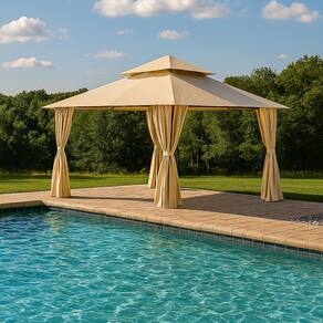 A cobertura em poliéster de alta qualidade protege contra o sol e o vento, enquanto as cortinas laterais inclusas proporcionam charme extra à decoração e mais privacidade para seus momentos de lazer.