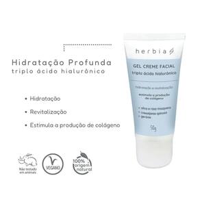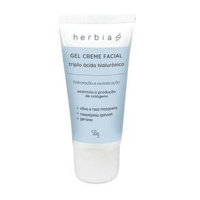 Gel Creme Facial Triplo Ácido Hialurônico Natural e Vegano 50g Herbia O triplo ácido hialurônico, a oliva, o rosa mosqueta e a tara são responsáveis por estimular a produção de colágeno, hidratando e revitalizando a pele na finalização da rotina skincare. De uso diurno ou noturno.