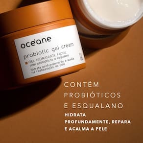 Os probióticos presentes em sua composição ajudam a equilibrar o microbioma da pele e também reforçam a barreira protetora da pele, protegendo-a contra o efeito de agressores externos, como a poluição, o sol e o vento, por exemplo. Isso contribui para uma pele saudável, previne espinhas, psoríase, vermelhidão e dermatites. Junte a isso o esqualano presente em sua fórmula, que é um derivado do óleo de oliva e um poderoso ingrediente que estimula a hidratação natural da pele. Este ativo ajuda a prevenir o ressecamento e a manter a umectação em dia. O resultado é uma pele equilibrada e hidratada com o auxílio dos ativos inovadores que compõem o Probiotic Gel Cream de Océane.